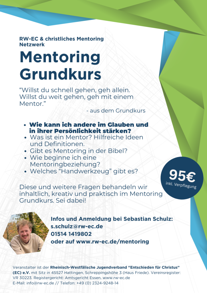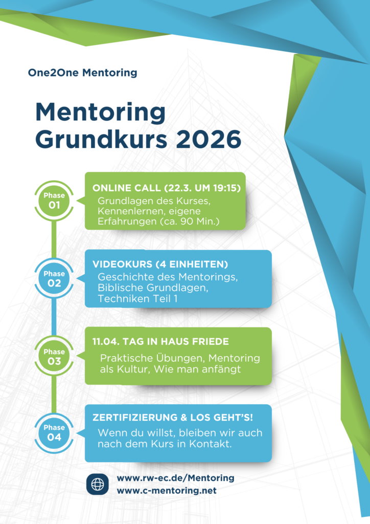 Um Mentoring im RW-EC zu stärken, vernetzen wir aktive MentorInnen und solche, die es werden wollen. Wir bieten regelmäßig den Mentoring Grundkurs mit Zertifizierung durch das christliche Mentoring Netzwerk (cMn) an und ermutigen besonders junge Menschen dazu, die Rolle als Mentorin oder Mentor auszuprobieren und sie sich zuzutrauen. Ebenso ermutigen wir all die, die im Glauben und in ihrer Persönlichkeit wachsen wollen, dazu, sich selbst durch Mentoring begleiten zu lassen.